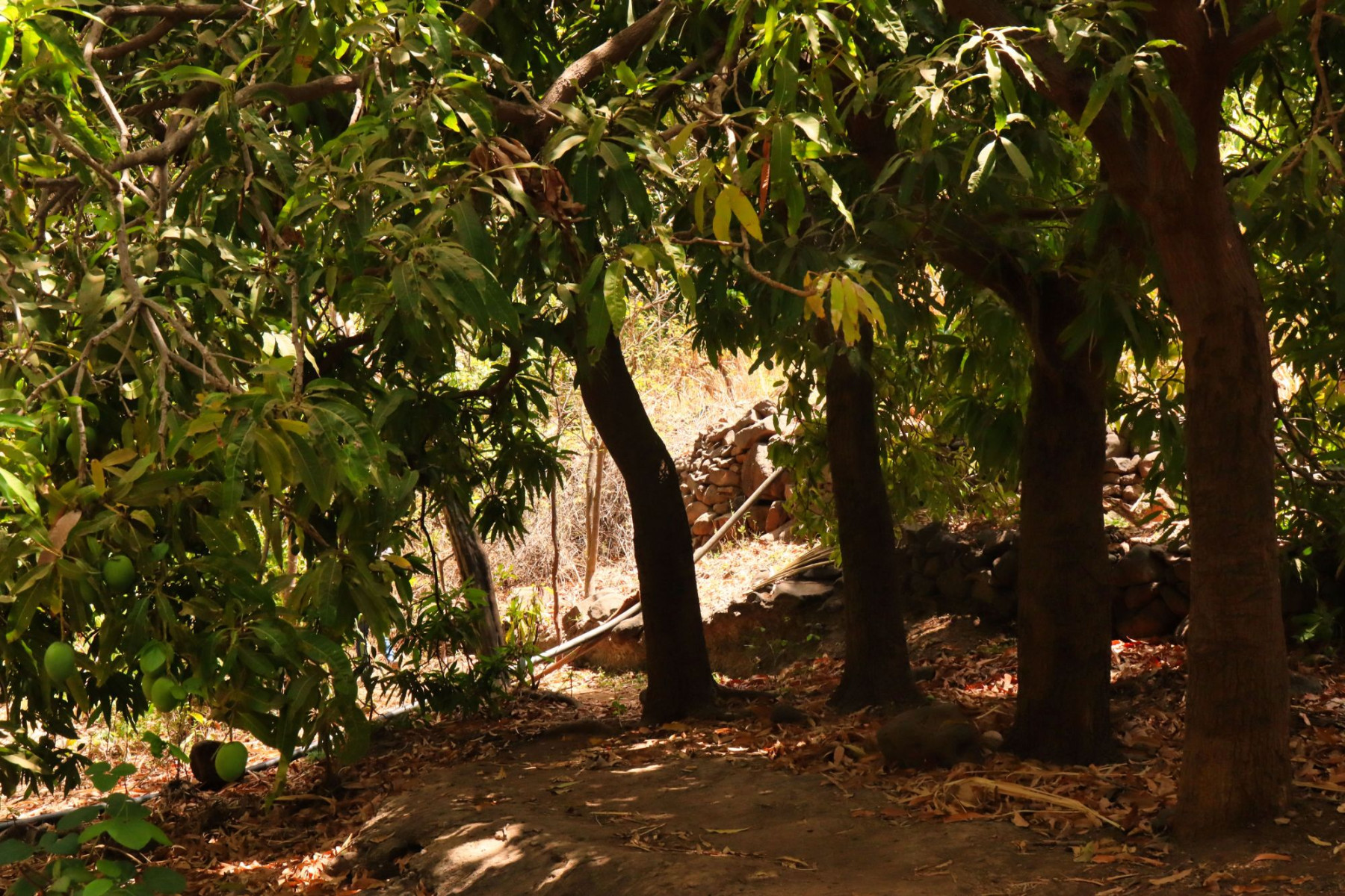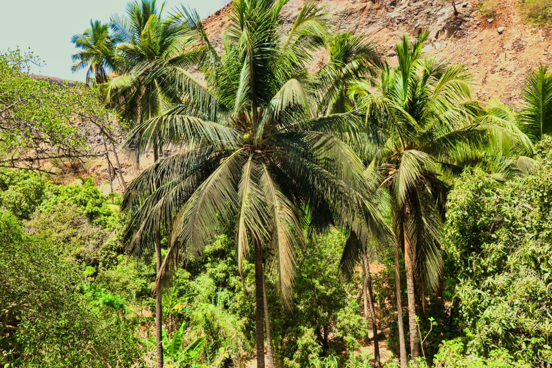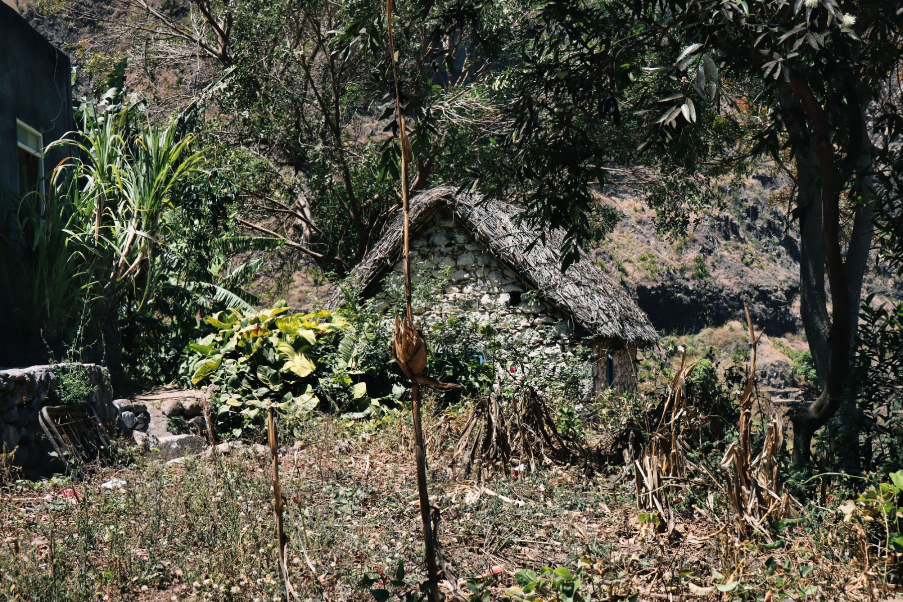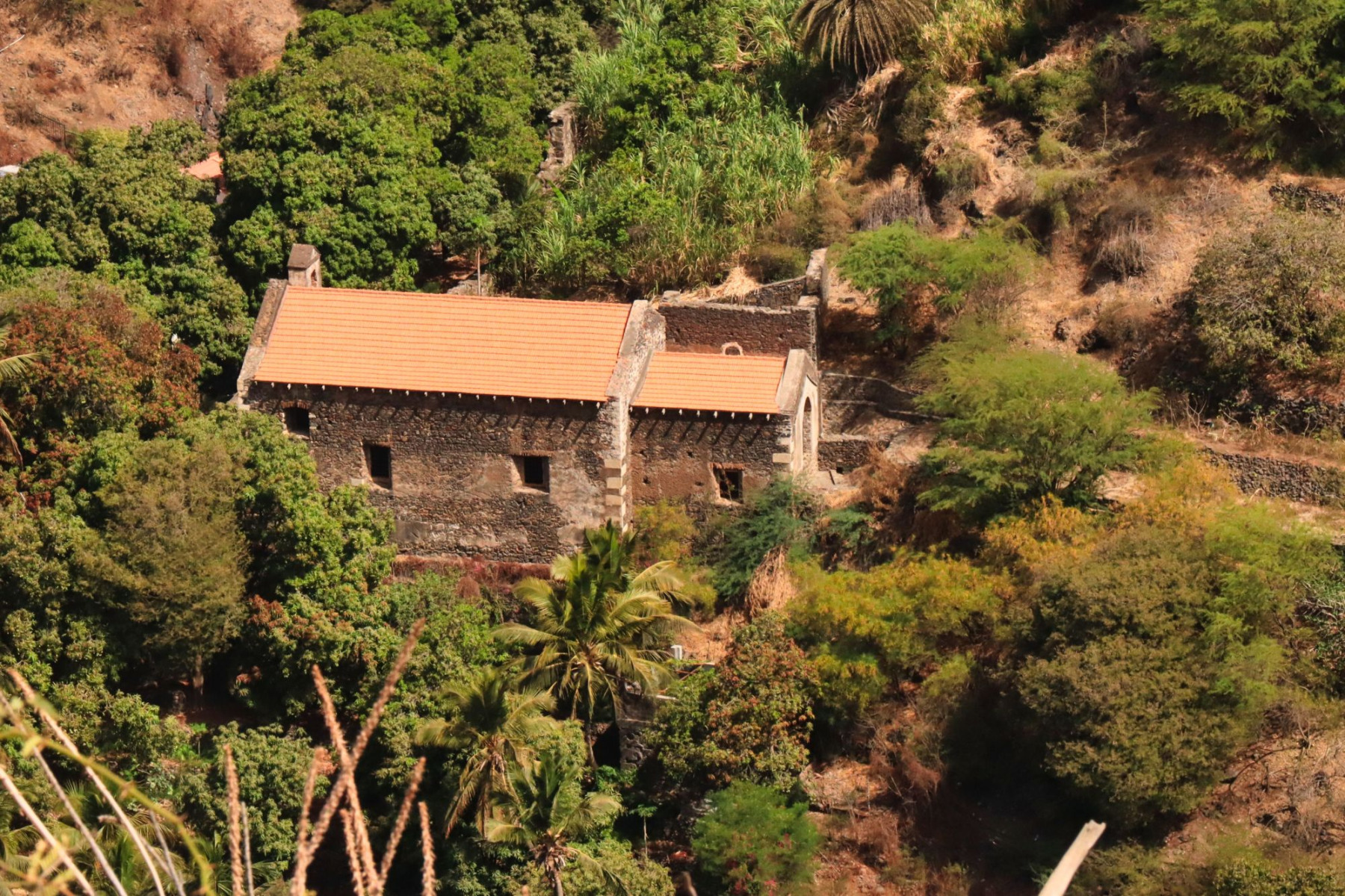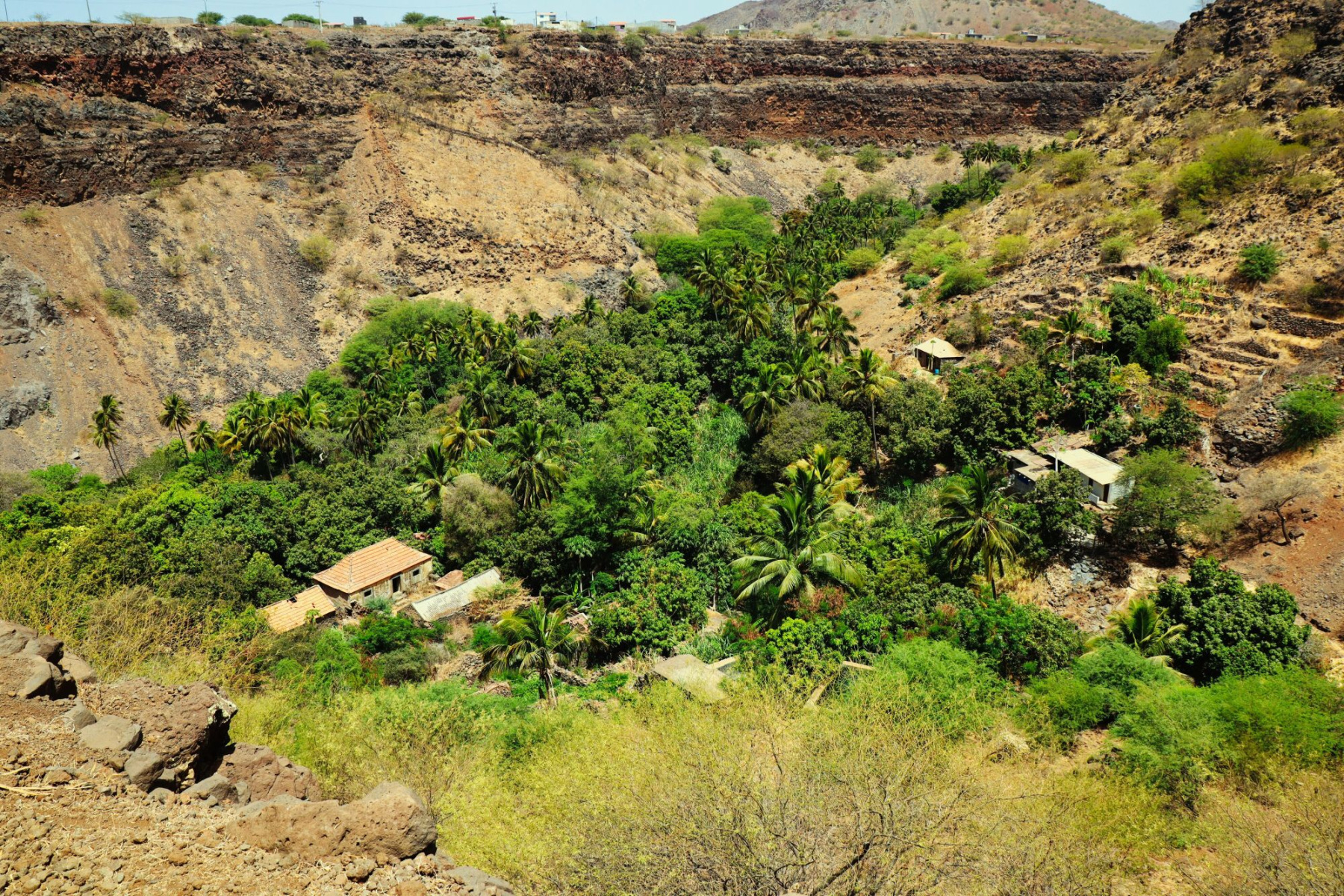 Da wir nicht nur der Kultur wegen, sondern auch um uns ein wenig die Beine zu vertreten hier heraus gefahren sind, folgen wir nun dem Vorschlag des Wanderführers und queren die staubtrockene Hochebene, einige Ziegengehöfte und den schmucklosen Ort Cabreiras um dann scharf links hinunter unvermittelt im tropischen Paradies zu landen. Hier wachsen Kokospalmen, Mangobäume, natürlich Bananen und andere exotische Früchte. Der Kontrast könnte stärker nicht sein.