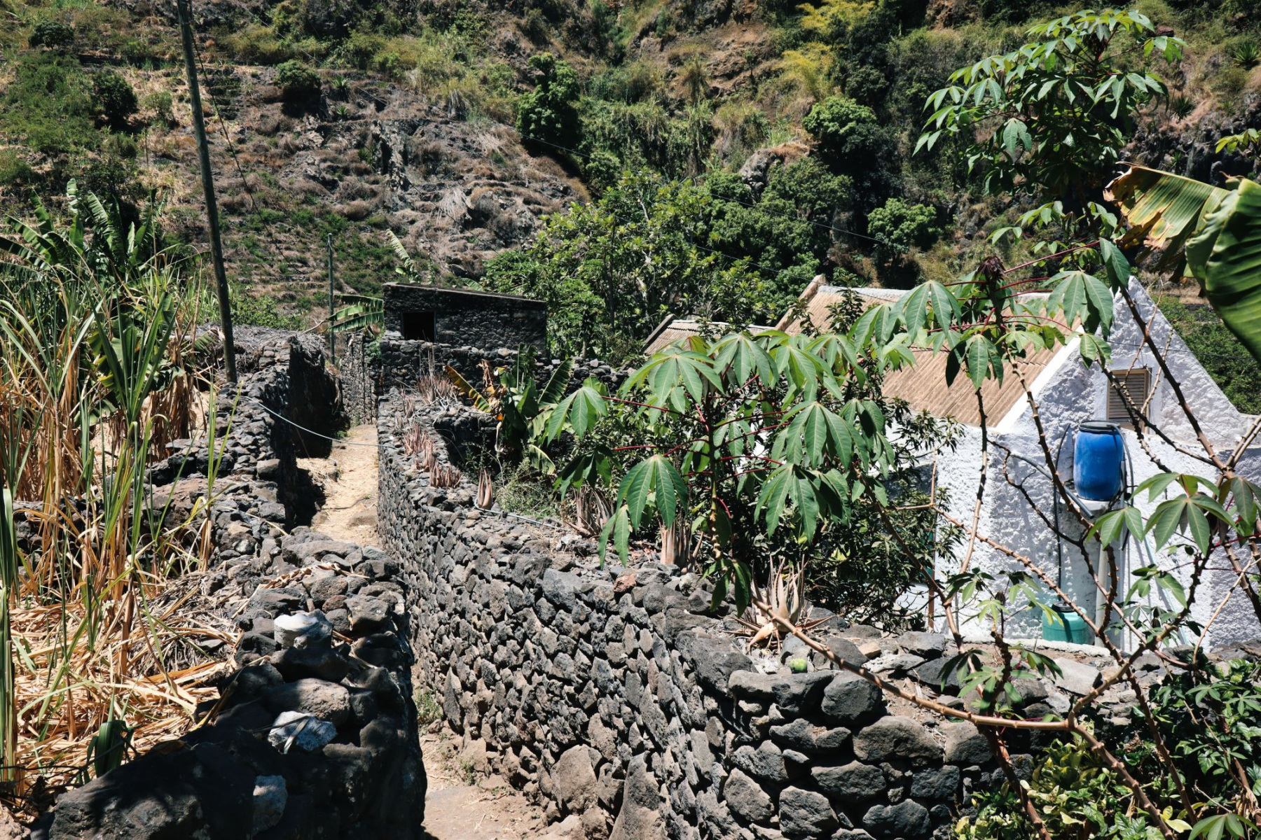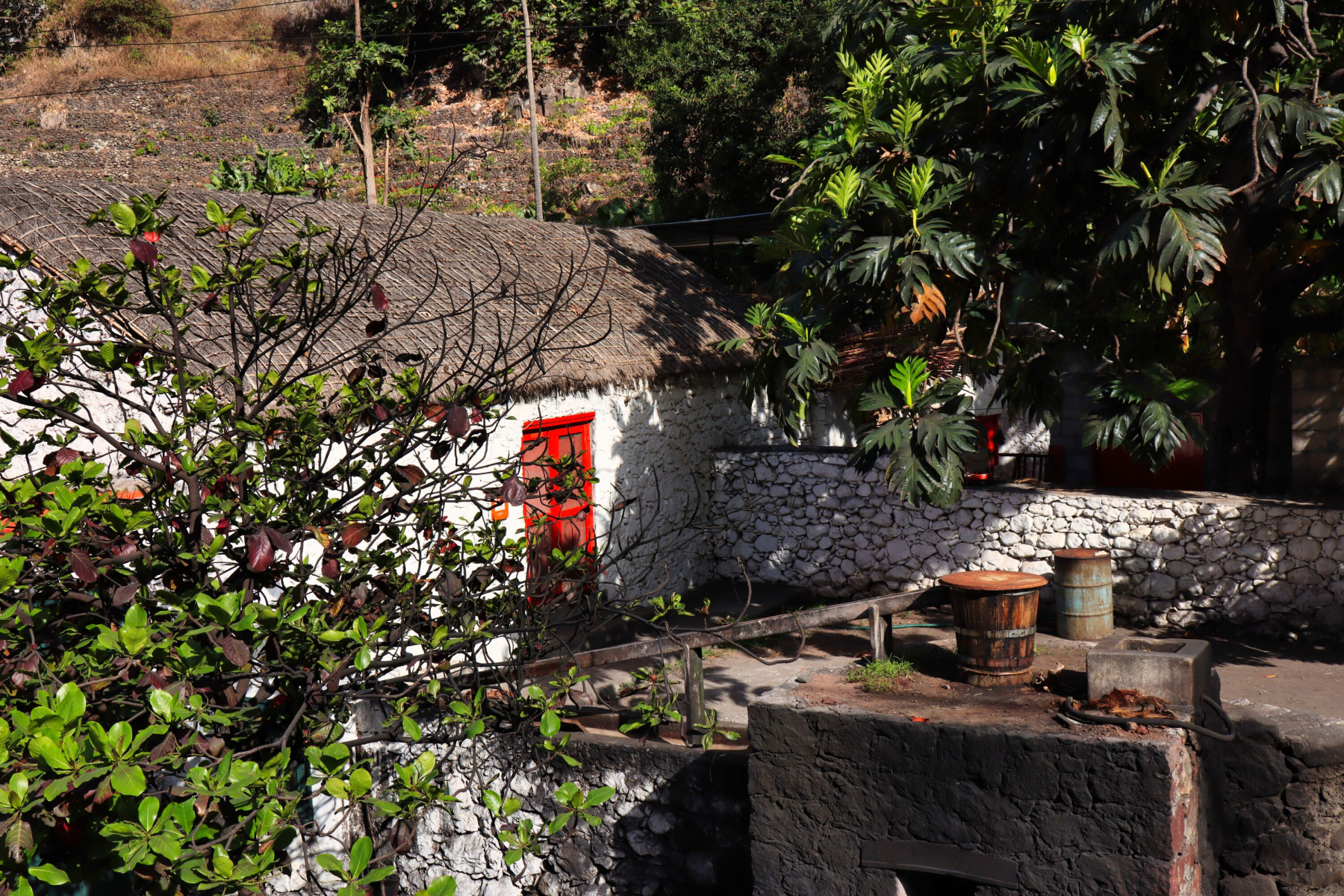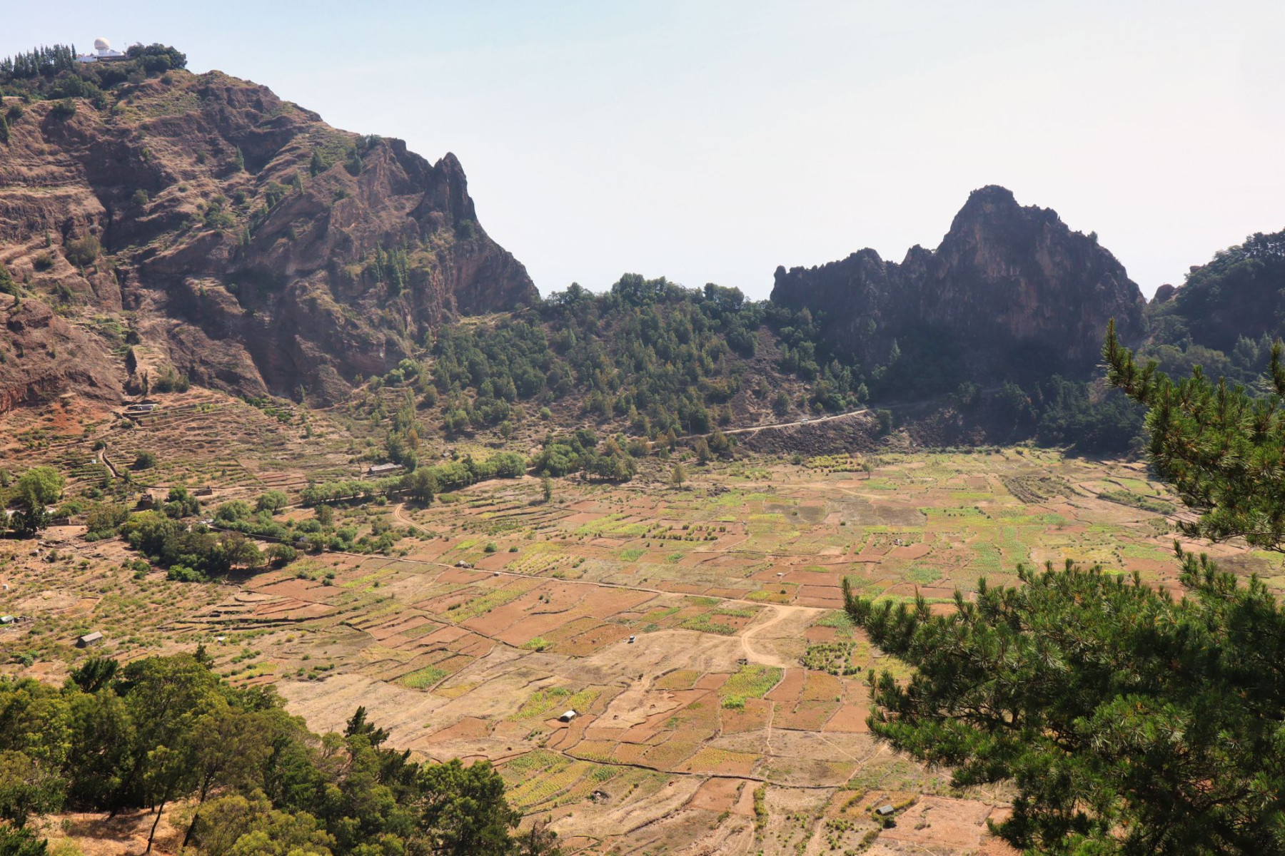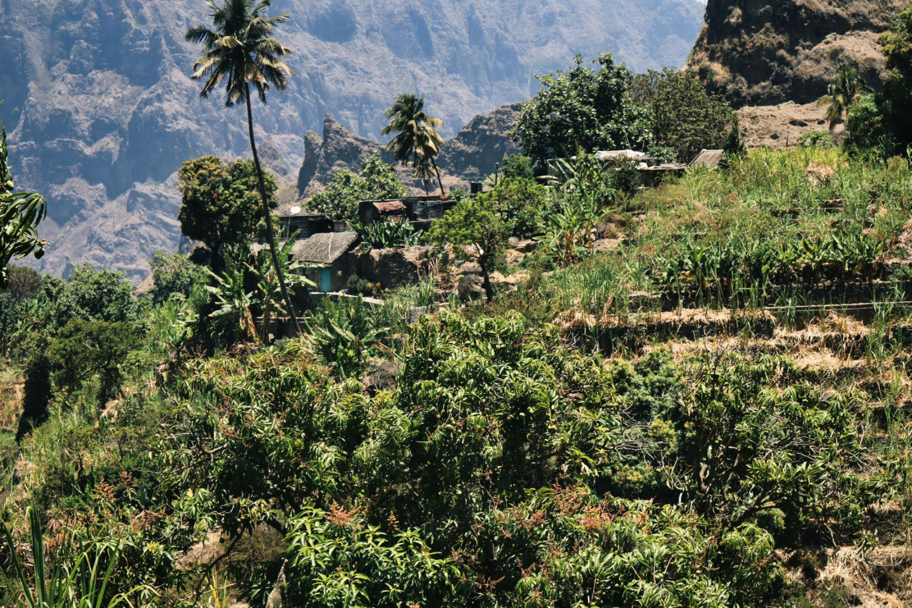 Da wir nicht nur der Kultur wegen, sondern auch um uns ein wenig die Beine zu vertreten hier heraus gefahren sind, folgen wir nun dem Vorschlag des Wanderführers und queren die staubtrockene Hochebene, einige Ziegengehöfte und den schmucklosen Ort Cabreiras um dann scharf links hinunter unvermittelt im tropischen Paradies zu landen. Hier wachsen Kokospalmen, Mangobäume, natürlich Bananen und andere exotische Früchte. Der Kontrast könnte stärker nicht sein.